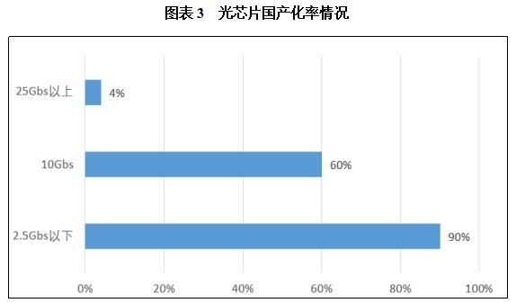 从国产化率来看,国内相关企业仅正在2。5G和10G光芯片范畴实现焦点手艺的控制,2。5G及以下速度光芯片国产化率跨越90%;10G光芯片国产化率约60%;25Gbs及以上的光芯片国产化率低,仅有4%。
