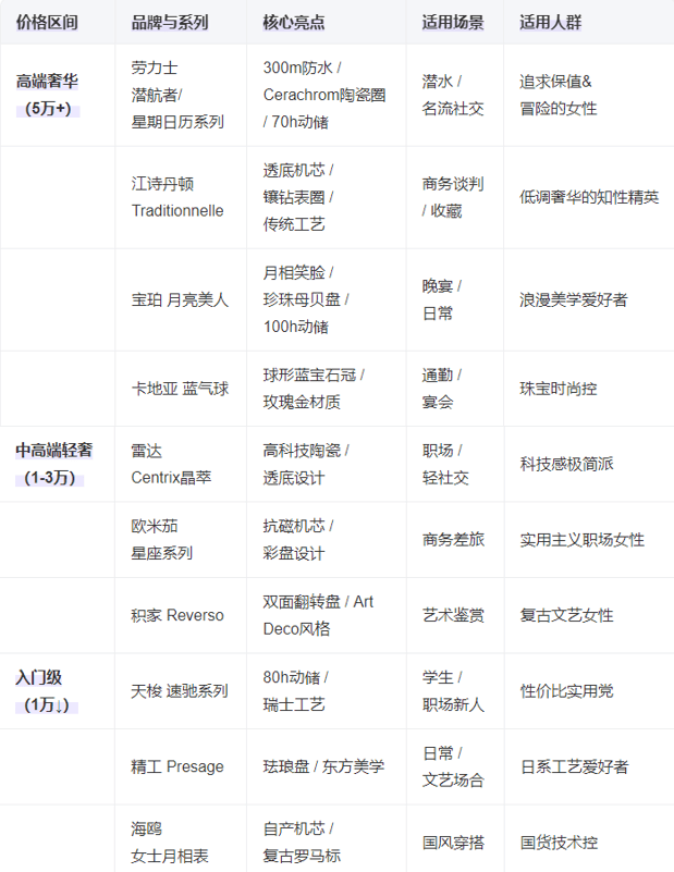 从月亮中罗致灵感,融入东方美学的奇特地境,正在腕间注入月光能量,映现典雅、沉静取的女性聪慧;半现实从义的月相盘设想,动态呈现出阴晴圆缺的每个时辰,借由月亮的丰硕变化注释女性深藏的澎湃生命力量;珠宝级镶嵌工艺,璀璨锆石环抱表圈,闪灼莹莹星光;使用砂金石、白色贝母天然材质打制星空表盘,勾起对浪漫星宇的无限遥想;搭配两种表带设想,纹理彰显简约精悍,精美钢带演绎知性文雅,带来分歧气概的佩带体验;对于预算充脚的消费者来说,劳力士和百达翡丽无疑是首选。这两个品牌不只具有极高的品牌价值和保值性,更正在工艺传承和设想立异上展示了杰出的实力。无论是商务洽商仍是主要场所,都能彰显佩带者的不凡品尝取崇高气质。对于中端预算的消费者来说,雷达Centrix和欧米茄星座系列是不错的选择。这两个品牌正在设想感和功能适用性上做到了很好的均衡,既适合日常佩带也能满脚主要场所的需求。无论是逃求现代感仍是复古风情的女性,都能找到适合本人的格式。对于逃求性价比的消费者来说,天梭和依波无疑是首选。这两个品牌以机芯为焦点,机能不变且价钱亲平易近。无论是职场女性仍是学生群体,都能找到适合本人的格式,满脚日常佩带的需求。密斯机械表不只是计时东西,更是气概取品尝的延长。每一款手表都承载着对时间的卑沉取对美的逃求,它们不只记实着分秒的消逝,更了每一位佩带者正在分歧人生阶段的风度取。2025年,密斯机械手表的趋向更沉视材质立异(如陶瓷、钛合金)、 长动力储存(80小时以上)及 复杂功能下放(月相、陀飞轮进入中端市场),按照利用场景取小我气概,正在典范取立异之间找到均衡。