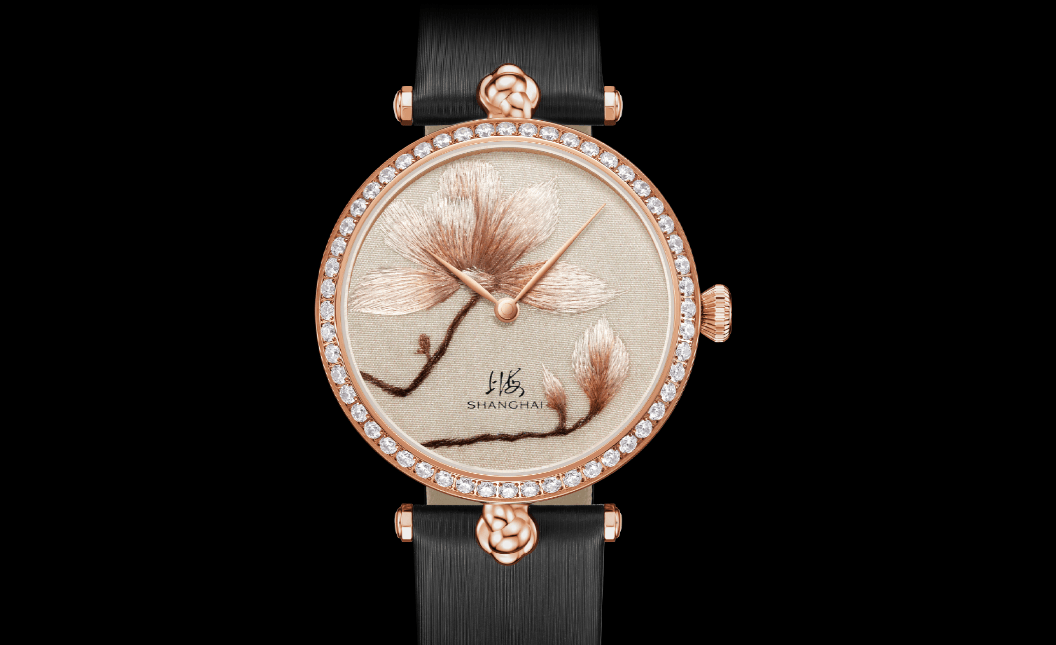 以上海市市斑白玉兰为设想灵感,并罗致上海顾绣的艺术意蕴,手表采用非遗身手苏绣(精微绣),一刺一绣如画做走笔般跃然绢布之上,玉兰绣韵如旗袍佳人,自绣画中款款步出,绽放芬芳取自傲。表盘便是画卷,花扣表耳外型好似旗袍盘扣,好像固定旗袍衣襟。